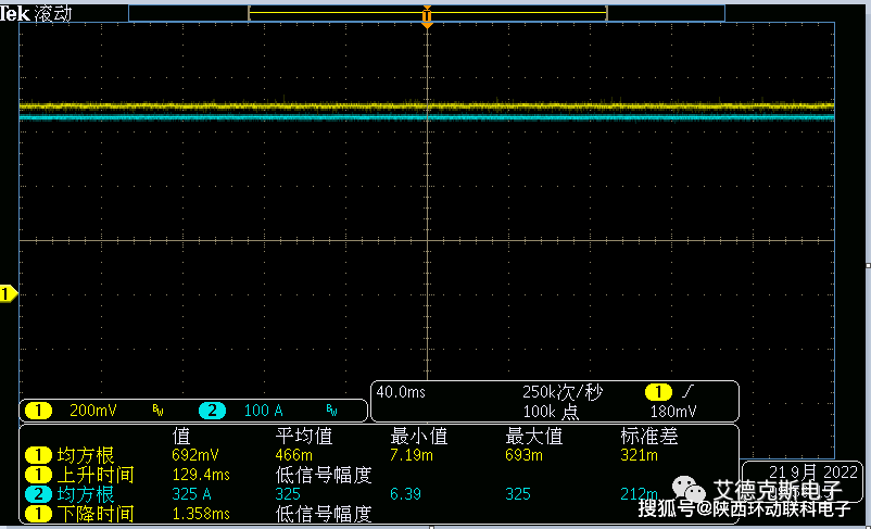 并机后上升速度可达30A/us,0~320A 最快可达12us。值得注意的是,由于电流速度过快,导线上感抗不可忽视,可采用低感抗测试线以减小电压的跌落。